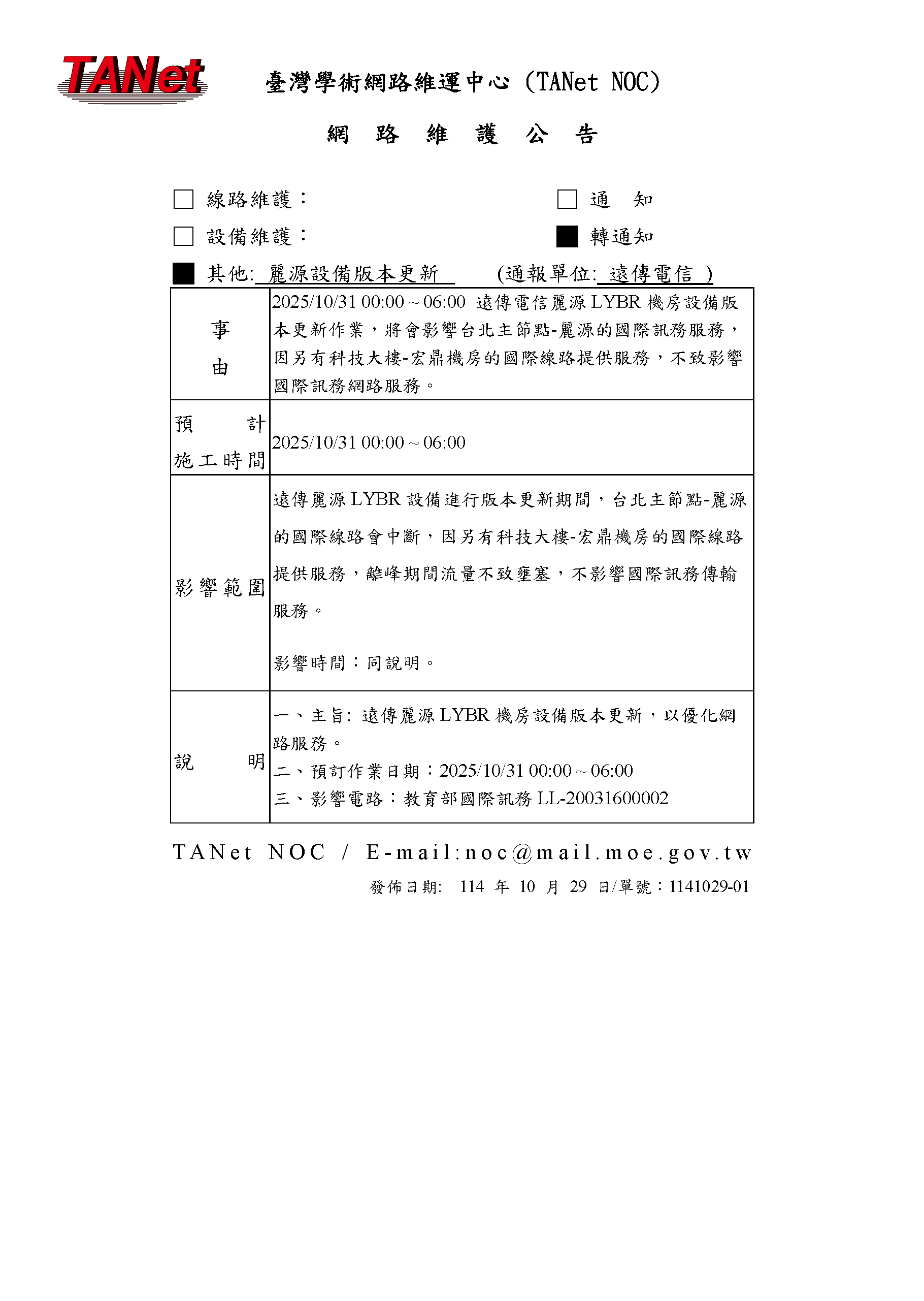 最新消息 【公告】2025/10/31 00:00 ~ 06:00 遠傳電信麗源LYBR機房設備版本更新作業,將會影響台北主節點-麗源的國際訊務服務,因另有科技大樓-宏鼎機房的國際線路提供服務,不致影響國際訊務網路服務 上一篇文章:【漏洞預警】Windows Server Update Services存在高風險安全漏洞(CVE-2025-59287),請儘速確認並進行修補 上一篇 下一篇文章:【公告】2025-11-01 18:00 ~ 22:00臺中區網執行TANet ASR 9K 韌體升級作業,期間臺中區網所接各連線單位之TANet網路服務將中斷多次,停止服務。 下一篇