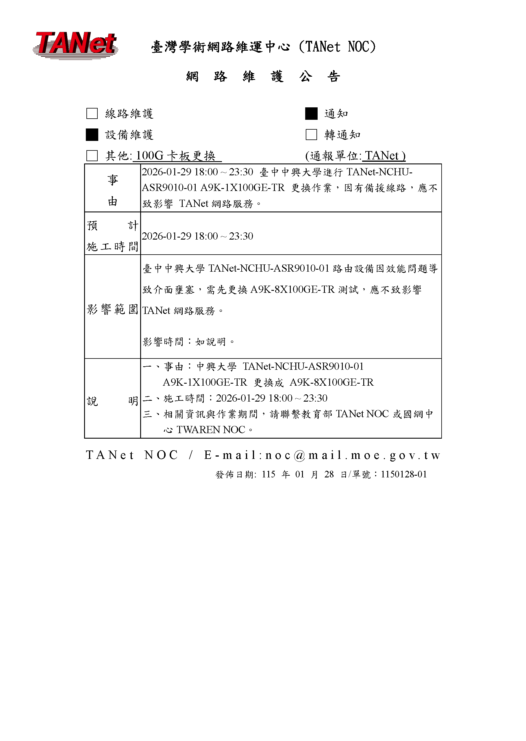 最新消息 【公告】2026-01-29 18:00 ~ 23:30 臺中區網(中興大學)進行TANet-NCHU-ASR9010-01 A9K-1X100GE-TR 更換作業,因有備援線路,應不致影響 TANet網路服務。 上一篇文章:【漏洞預警】SolarWinds旗下Web Help Desk (WHD)存在4個重大資安漏洞 上一篇 下一篇文章:【漏洞預警】CISA新增6個已知遭駭客利用之漏洞至KEV目錄(2026/01/19-2026/01/25) 下一篇
