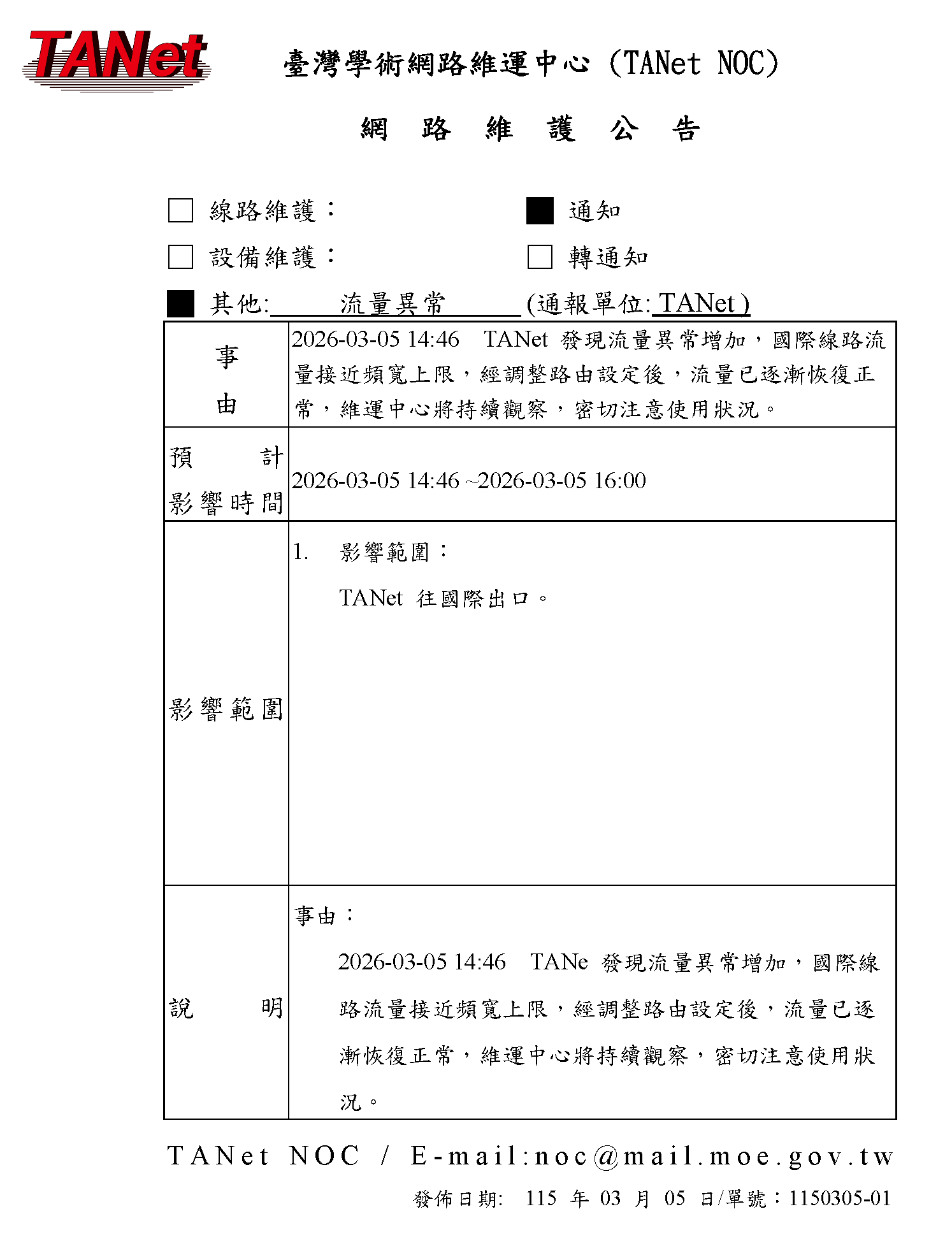 最新消息 【公告】2026-03-05 14:46 TANet 發現流量異常增加,國際線路流量接近頻寬上限,經調整路由設定後,流量已逐漸恢復正常,維運中心將持續觀察,密切注意使用狀況。 下一篇文章:【漏洞預警】一等一科技|U-Office Force - Insecure Deserialization 下一篇