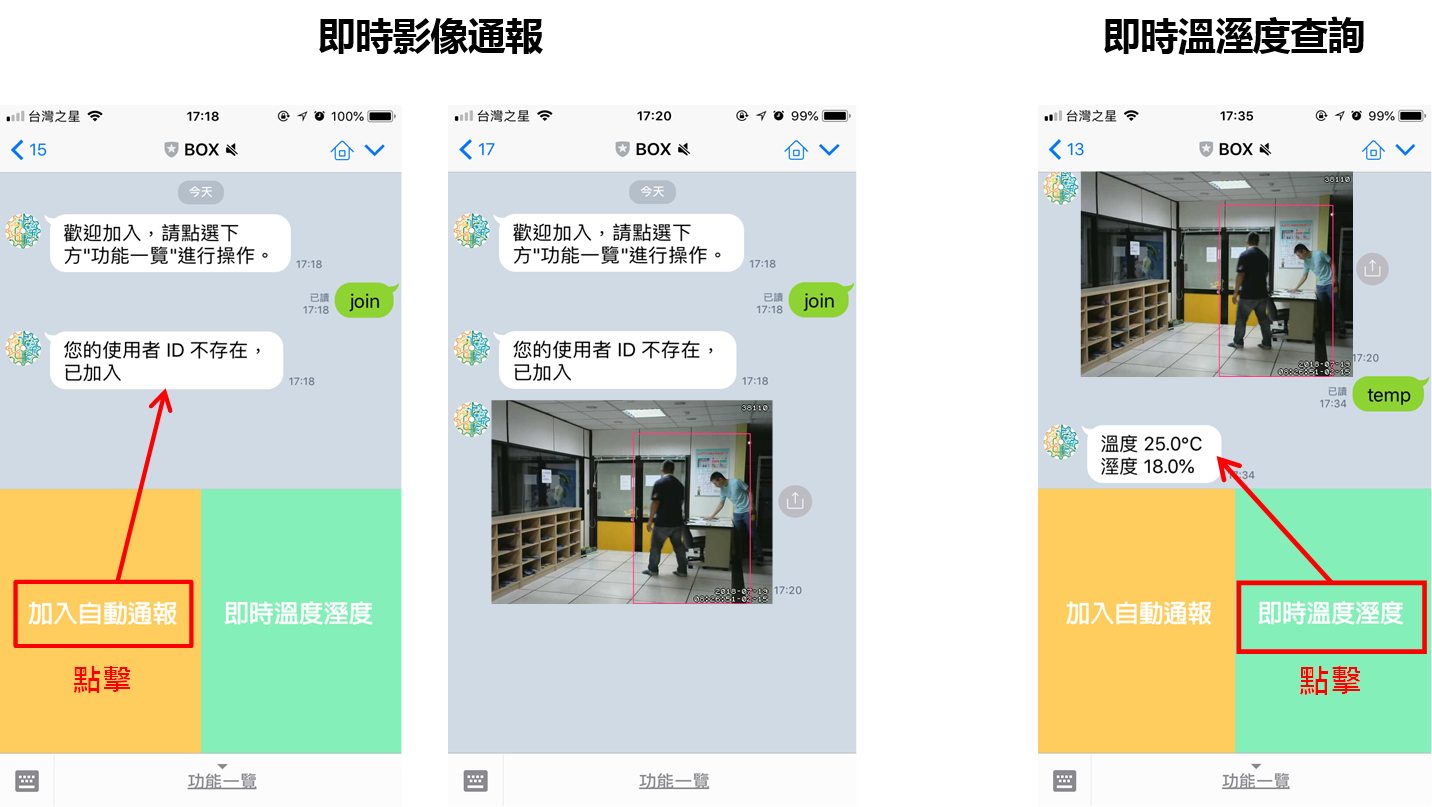 區網中心以樹莓派與開源軟體實作具有即時通報功能的監視系統,可持續偵測移動個體並推播影像至手機通訊軟體,實際導入至臺中區網中心機房,除了提升資訊機房安全防護之外,亦建立起人員進出的有效查核機制,管理者不必花費大量時間調閱監視影像;此外,結合樹莓派的通用輸入輸出介面,開發出交談式溫溼度查詢功能,讓機房管理者可即時掌握重要環境因素,可以有效提升機敏性場域的管理效率與保全機制。