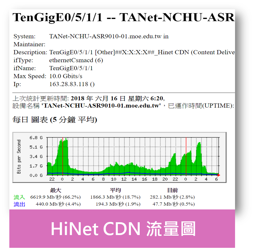 區網中心於103.1.7建置完成並正式運作。此項服務可增進TANet連線單位使用者對HiNet影音資料存取的速度及品質。今年6月曾觀察到世大運期間尖峰的流量為6.6Gbps。本項服務的對象包含所有TANet連線單位。
