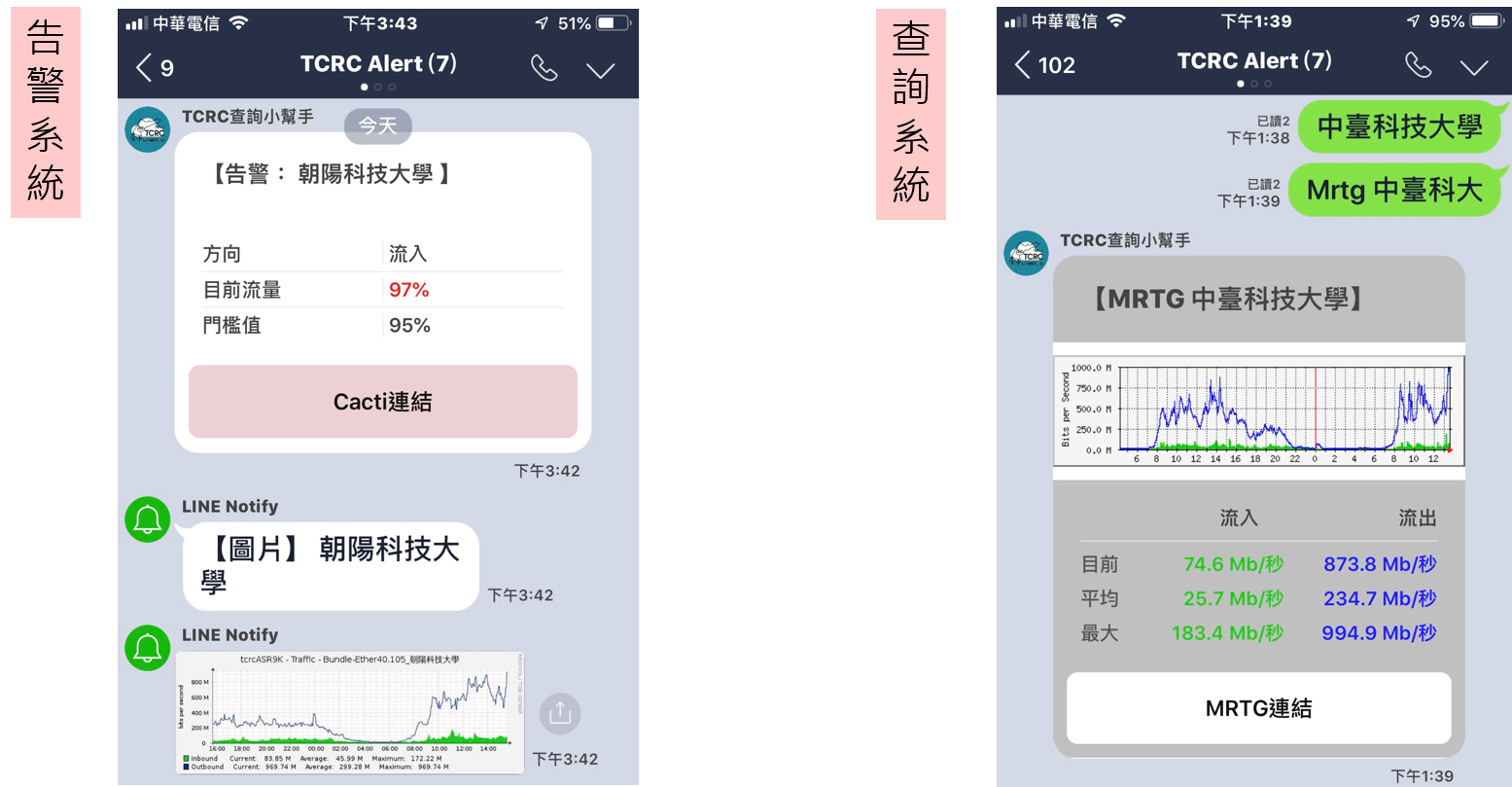 為了提供更穩定的網路服務,臺中區網中心整合了開源軟體的網路流量監控工具與手機免費的通訊APP軟體,建置「自動告警機制應用系統」和「回覆式網路流量即時查詢應用系統」。自動告警系統與傳統的告警服務相比,傳統使用電子郵件的方式通知所屬連線單位的負責人,但這樣無法第一時間得知流量異常,屬於非即時式的告警機制,我們的系統因應智慧型手機的盛行,特別採用國人所使用的主流通訊軟體-LINE做為通訊媒介,讓臺中區網中心的連線單位之網管負責人在網路流量異常時能第一時間掌握網路流量的資訊,達到網路異常即時處理與災損控制的目標;也可藉由查詢應用系統讓連線單位能即時查詢網路流量,達到對網路流量的偵測和監控。