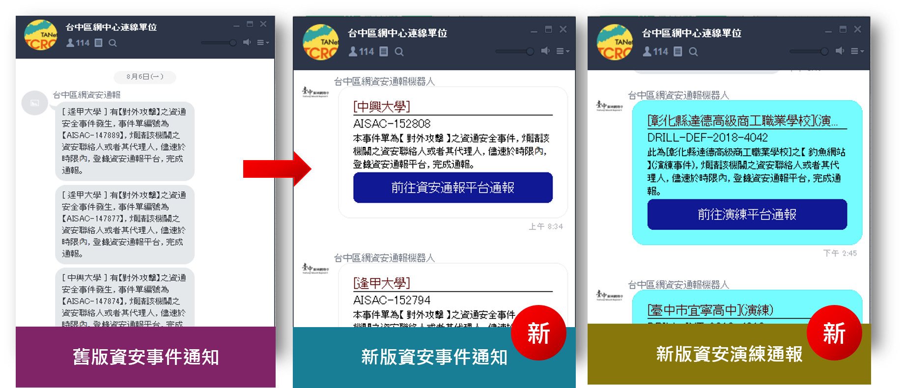 去年研發LINE BOT機器人於此群組進行資安事件自動即時通知,以確保連線單位能即時進行通報與應變。並於107年1月29日在TANet_100G網路維運技術研討會中進行「LINE