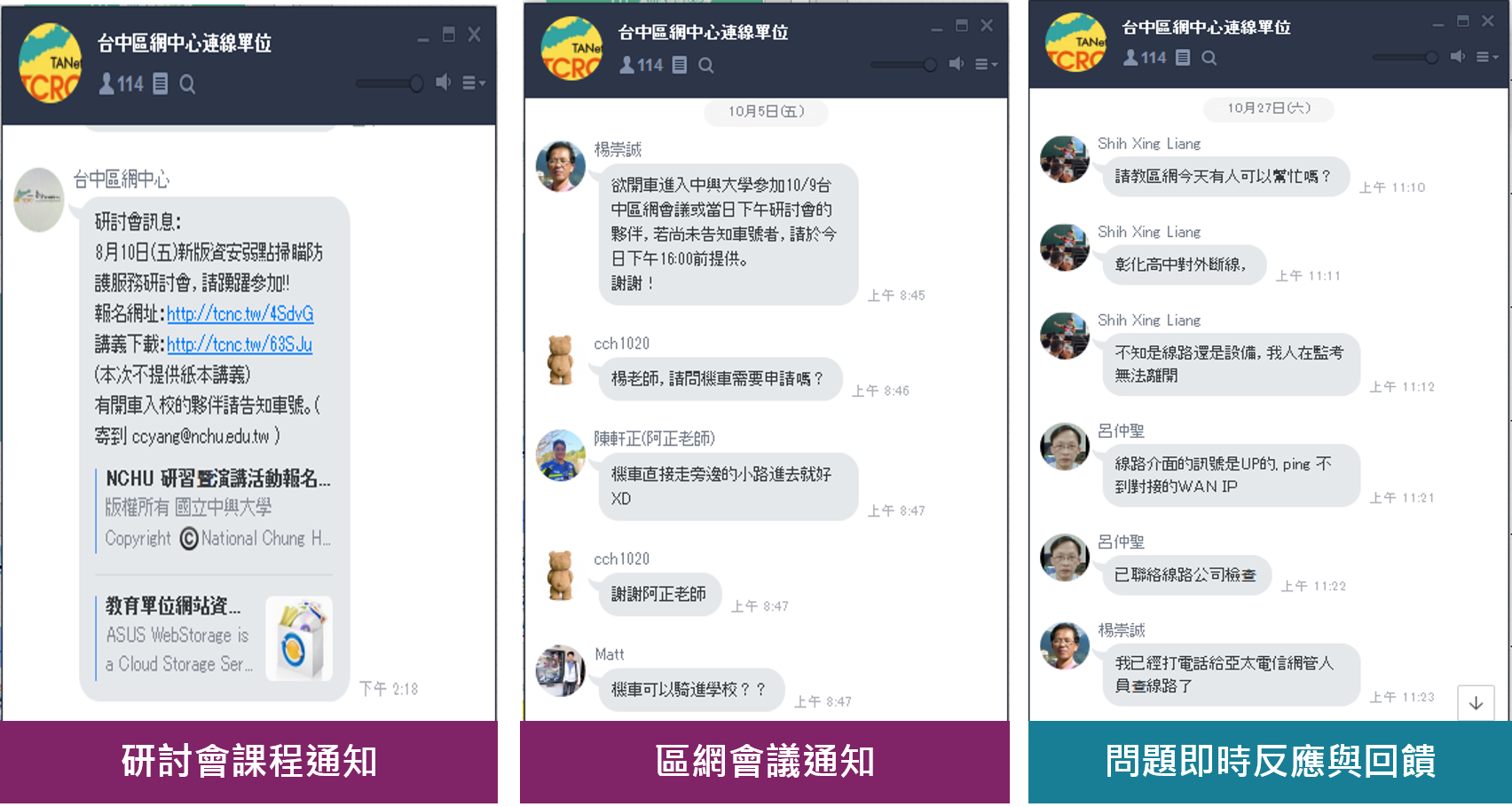 為了能更即時與台中區網中心夥伴聯絡,臺中區網於104.08.17成立Line群組,此群組提供緊急時件通知、研討會報名提醒、網路問題及時反應。
